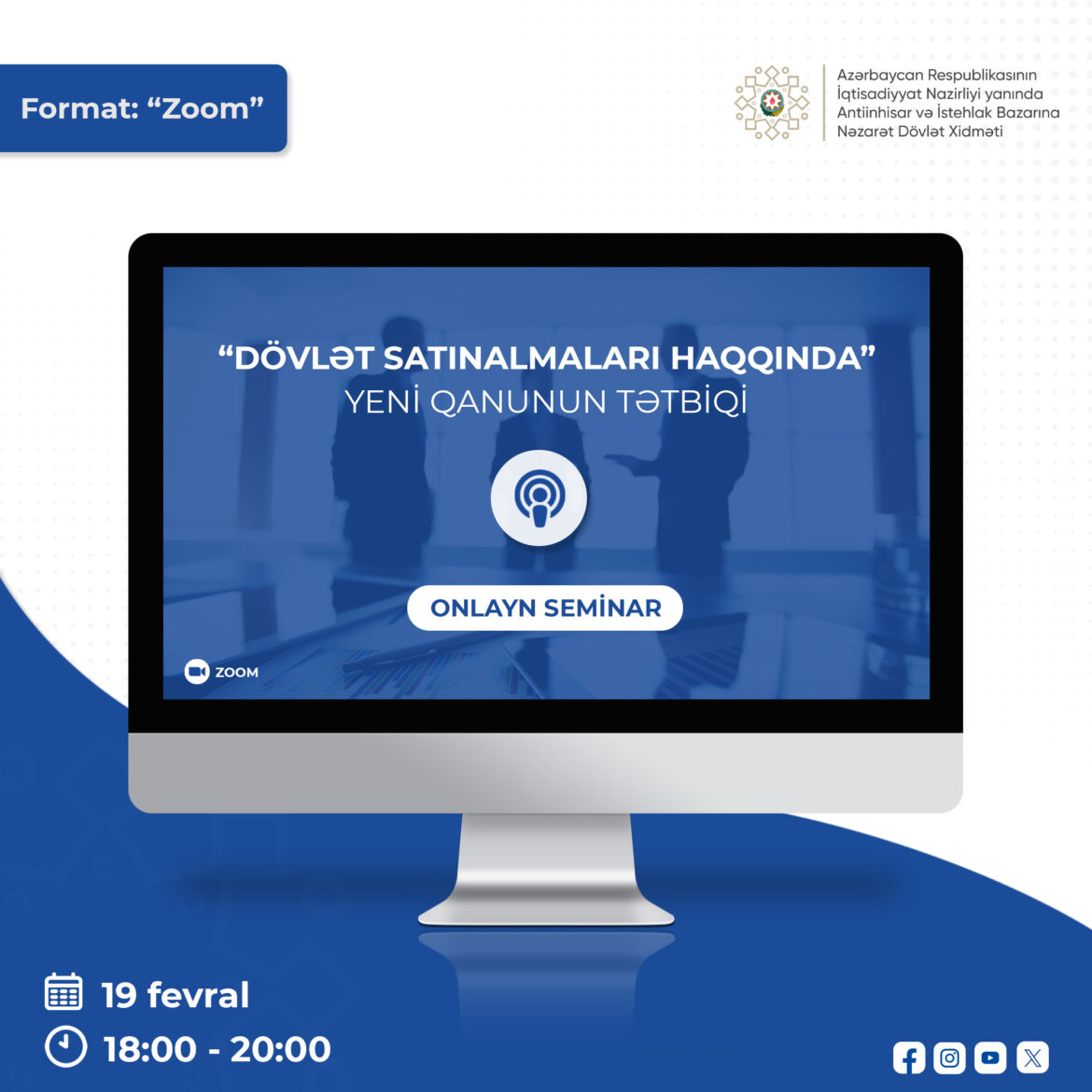 İqtisadiyyat Nazirliyi yanında Antiinhisar və İstehlak Bazarına Nəzarət Dövlət Xidməti tərəfindən “Dövlət satınalmaları haqqında” yeni Qanunun tətbiqi ilə bağlı seminar keçiriləcək. Seminar elektron formatda “Zoom” platforması üzərindən təşkil ediləcək.