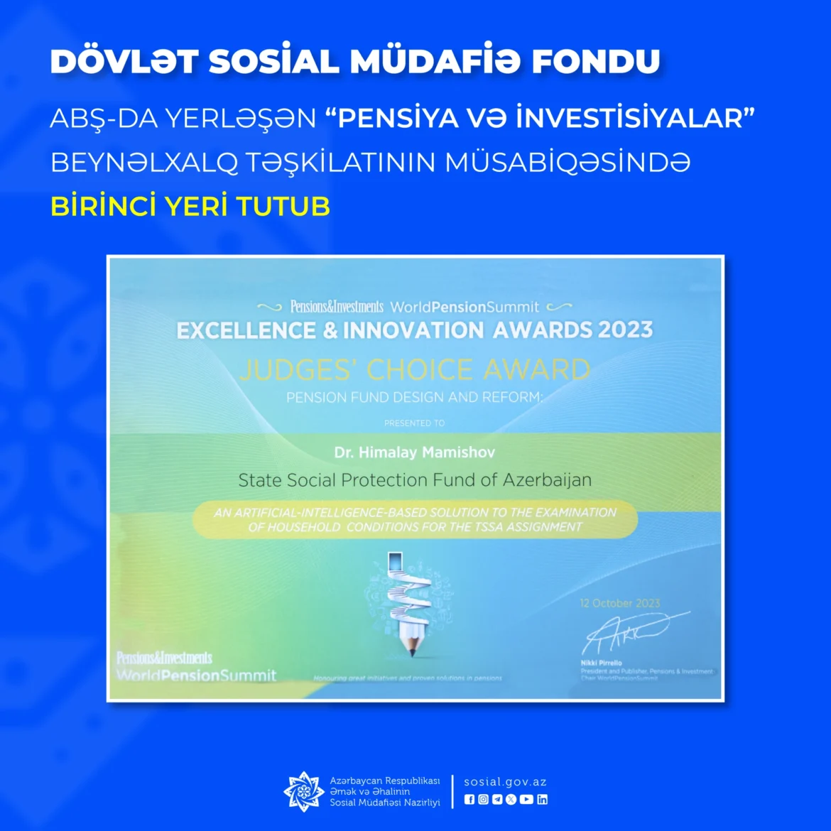 Münsiflər heyətinin yekdil qərarına əsasən DSMF-nin bu layihəsi “Pension Fund Design & Reform” kateqoriyası üzrə ilk yerə layiq görülüb.