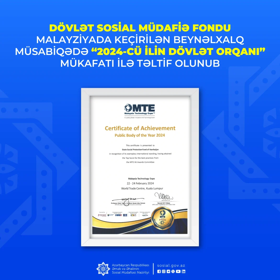 Əmək və Əhalinin Sosial Müdafiəsi Nazirliyinin tabeliyindəki Dövlət Sosial Müdafiə Fondu (DSMF) həmin beynəlxalq müsabiqədə uğur qazanıb.
