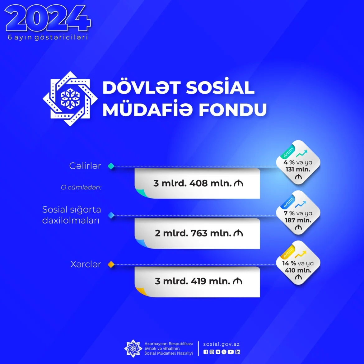 Əmək və Əhalinin Sosial Müdafiəsi Nazirliyinin tabeliyində Dövlət Sosial Müdafiə Fondunun (DSMF) gəlirləri bu ilin 6 ayında proqnozla müqayisədə 4 faiz və ya 131 mln. manat çox olmaqla 3 mlrd. 408 mln. manat təşkil edib.