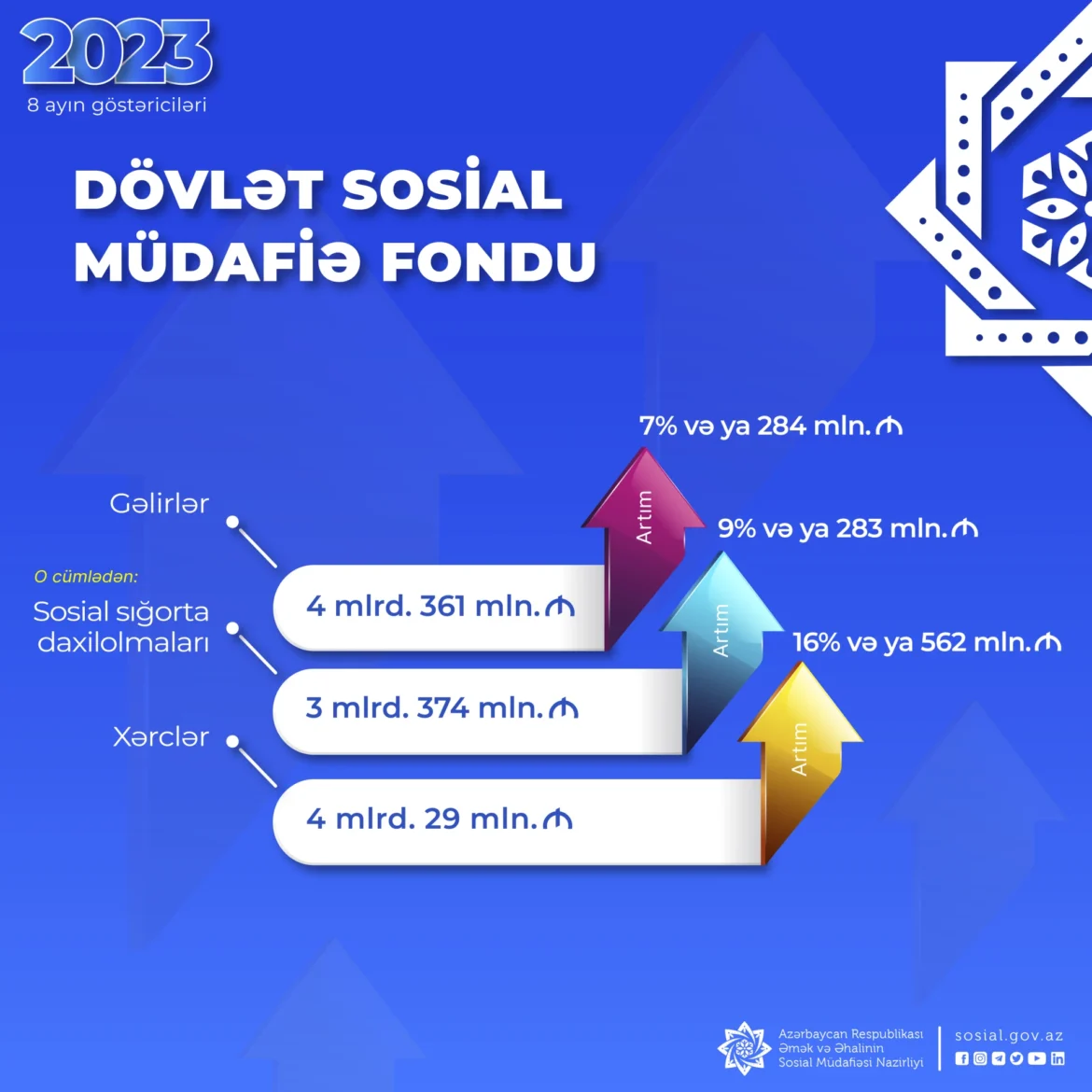 Əmək və Əhalinin Sosial Müdafiəsi Nazirliyinin tabeliyindəki Dövlət Sosial Müdafiə Fondunun (DSMF) gəlirləri bu ilin 8 ayında proqnozla müqayisədə 7 faiz və ya 284 mln. manat çox olmaqla 4 mlrd. 361 mln. manat təşkil edib.