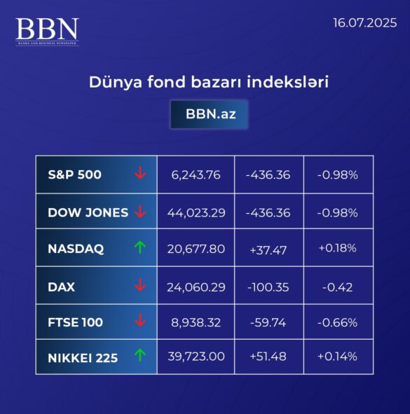 DünyaFond bazarları Dünya fond bazarı indekslərinin son göstəriciləri-16.07.2025 by yunus 16/07/2025 16/07/2025 0 comments 3 views 0 minutes read 3 BBN.az dünya fond bazarı indekslərinin son göstəricilərini təqdim edir. Ötən gün ABŞ və Avropa fond bazarlarında eniş müşahidə edilib.İyulun 15-də ABŞ fond bazarlarında əsas indekslər enişlə bağlanıb. Dünya fond bazarı Share 0 FacebookTwitterLinkedinOdnoklassnikiWhatsappTelegramEmail previous post “İcraçı Kredit Agentliyi” BOKT ləğv olunur next post Birbank Biznes-in dəstəyi ilə keçirilən She’s Next təşəbbüsünün qalibləri müəyyənləşdi You may also like “Morgan Stanley”: Texnologiya şirkətlərinin səhmləri daha da yüksələ bilər 10/02/2026 Avropa İttifaqı “WhatsApp”da süni intellektə çıxışın məhdudlaşdırılmasını araşdırır 10/02/2026 Anthropic- in dəyəri 350 milyard dollara çata bilər 10/02/2026 “Rəqəmsal avro Avropa iqtisadiyyatı üçün strateji əhəmiyyət kəsb edir” 10/02/2026 Qlobal iqtisadi yavaşlama fonunda Mərkəzi Asiya ölkələri sürətlə böyüyür 09/02/2026 IMF: Azərbaycanın qeyri-neft iqtisadiyyatı bu il 4%-ə yaxın artacaq 09/02/2026 Leave a Comment Cancel Reply Your rating: Save my name, email, and website in this browser for the next time I comment. Δ