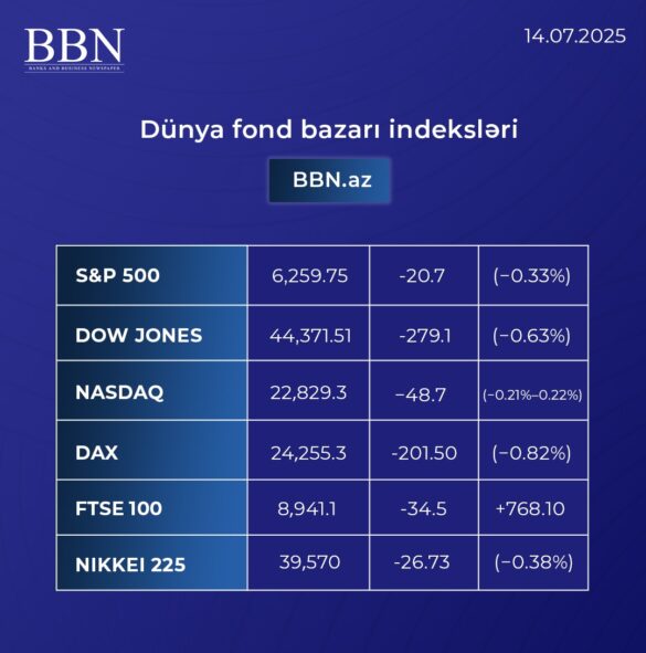 DünyaFond bazarları Dünya fond bazarı indekslərinin son göstəriciləri by yunus 14/07/2025 14/07/2025 0 comments 4 views 0 minutes read 4 BBN.az dünya fond bazarı indekslərinin son göstəricilərini təqdim edir. S&P 500, Dow Jones, Nasdaq 100, DAX, FTSE 100 və Nikkei 225 indeksləri üzrə ən son göstəricilər qlobal bazarlardakı trendləri göstərir. Dünya fond bazarı Share 0 FacebookTwitterLinkedinOdnoklassnikiWhatsappTelegramEmail previous post Trampdan “önəmli bəyanat”: Rusiya aktivləri, NATO və Ukraynaya silah ixracı gündəmdə next post Bank “BTB” II rüb üzrə maliyyə göstəricilərini açıqladı. You may also like “Nebius” konvertasiya olunan istiqrazların yerləşdirilməsi nəticəsində $4 mlrd. cəlb edib 19/03/2026 Qlobal Bazarlarda “Qırmızı Tufan”: Neft və Qaz Sıçrayır, Səhmlər Çökür! 19/03/2026 EBRD Azərbaycanda cari layihələr portfelini və əməliyyat aktivlərini artırıb 19/03/2026 “Fitch”: Neftin qiyməti 100 dollar səviyyəsində qalarsa, qlobal resessiya riski artacaq 18/03/2026 Böyük Britaniyada yanacaq qiymətləri son 18 ayın ən yüksək həddini keçib 18/03/2026 Dollar Fed-in iclası ərəfəsində ucuzlaşır 18/03/2026 Leave a Comment Cancel Reply Your rating: Save my name, email, and website in this browser for the next time I comment. Δ