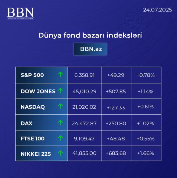 DünyaFond bazarlarıHamısı Dünya fond bazarlarının əsas indeks göstəriciləri-24.07.2025 by Zeyneb 24/07/2025 24/07/2025 0 comments 2 views 0 minutes read 2 BBN.az dünya fond bazarlarının əsas indeks göstəricilərini təqdim edir Share 0 FacebookTwitterLinkedinOdnoklassnikiWhatsappTelegramEmail previous post Rəsmi valyuta məzənnələri-24.07.2025 next post Beynəlxalq əmtəə bazarlarının göstəriciləri-24.07.2025 You may also like “Anthropic” ABŞ administrasiyasını məhkəməyə verib 10/03/2026 Qlobal bazarlarda qarışıq dinamika: qızıl və qaz bahalaşır, ABŞ indekslərində eniş müşahidə olunur 10/03/2026 Beynəlxalq əmtəə, fond və valyuta bazarlarının göstəriciləri (10.03.2026) 10/03/2026 Nazir Rəşad Nəbiyev “Dell Technologies” şirkətinin Avropa,Yaxın Şərq və Afrika üzrə prezidenti ilə görüşüb 06/03/2026 BVF neft şoku ilə bağlı həyəcan təbili çalır 06/03/2026 Yusif Poladov Ekologiya və Təbii Sərvətlər Nazirliyi yanında İctimai Şuraya üzv seçilib 05/03/2026 Leave a Comment Cancel Reply Your rating: Save my name, email, and website in this browser for the next time I comment. Δ