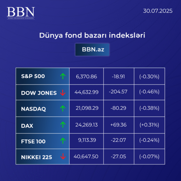 DünyaFond bazarları Dünya fond bazarlarının əsas indeks göstəriciləri-30.07.2025 by Zeyneb 30/07/2025 30/07/2025 0 comments 2 views 0 minutes read 2 BBN.az dünya fond bazarlarının əsas indeks göstəricilərini təqdim edir Share 0 FacebookTwitterLinkedinOdnoklassnikiWhatsappTelegramEmail previous post Rəsmi valyuta məzənnələri-30.07.2025 next post Beynəlxalq əmtəə bazarlarının göstəriciləri-30.07.2025 You may also like Beynəlxalq əmtəə və fond bazarlarının göstəriciləri (13.03.2026) 13/03/2026 OPEC Azərbaycanda sutkalıq neft hasilatının həcmini açıqlayıb 12/03/2026 Tramp administrasiyası 16 ticarət tərəfdaşı ilə bağlı araşdırmalara başlayıb 12/03/2026 Beynəlxalq əmtəə və fond bazarlarının göstəriciləri (12.03.2026) 12/03/2026 Ağ Ev: Neft qiymətlərindəki artım müvəqqətidi 11/03/2026 “Anthropic” ABŞ administrasiyasını məhkəməyə verib 10/03/2026 Leave a Comment Cancel Reply Your rating: Save my name, email, and website in this browser for the next time I comment. Δ