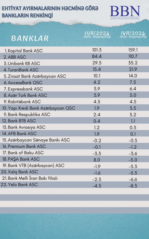 Banklar və Biznes nəşri BBN.az maliyyə göstəricilərini Azərbaycan Banklar Assosiasiyasına (ABA) təqdim etmiş bankların ehtiyat ayırmalarının həcminə görə renkinqini təqdim edir.