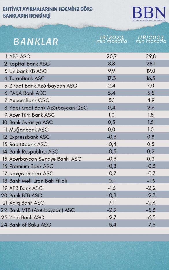 Banklar və Biznes nəşri BBN.az maliyyə göstəricilərini Azərbaycan Banklar Assosiasiyasına (ABA) təqdim etmiş bankların ehtiyat ayırmalarının həcminə görə renkinqini təqdim edir.