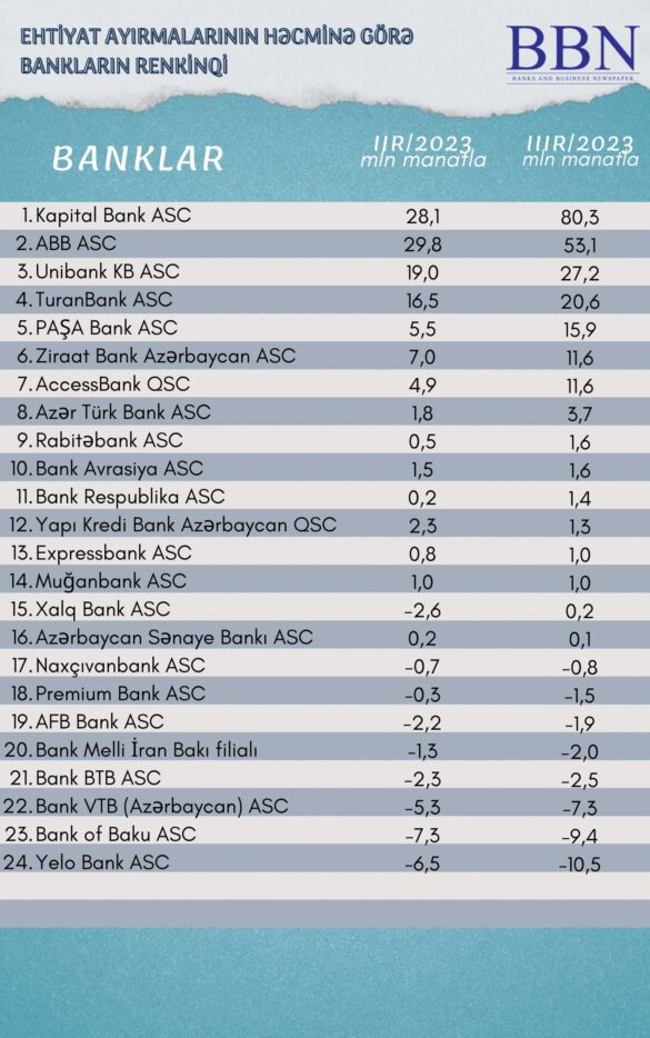 Banklar və Biznes nəşri BBN.az maliyyə göstəricilərini Azərbaycan Banklar Assosiasiyasına (ABA) təqdim etmiş bankların ehtiyat ayırmalarının həcminə görə renkinqini təqdim edir.