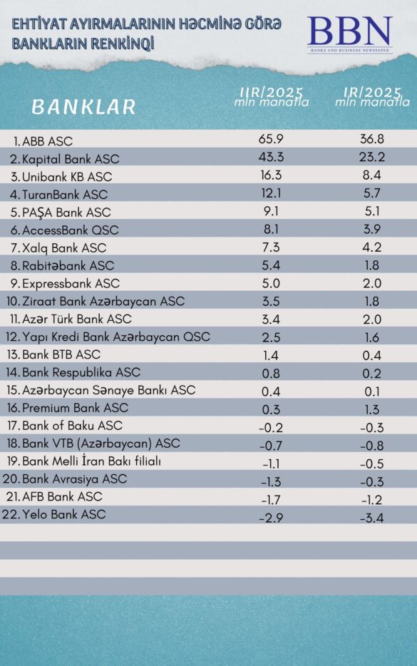 Banklar və Biznes nəşri BBN.az maliyyə göstəricilərini Azərbaycan Banklar Assosiasiyasına (ABA) təqdim etmiş bankların ehtiyat ayırmalarının həcminə görə renkinqini təqdim edir.