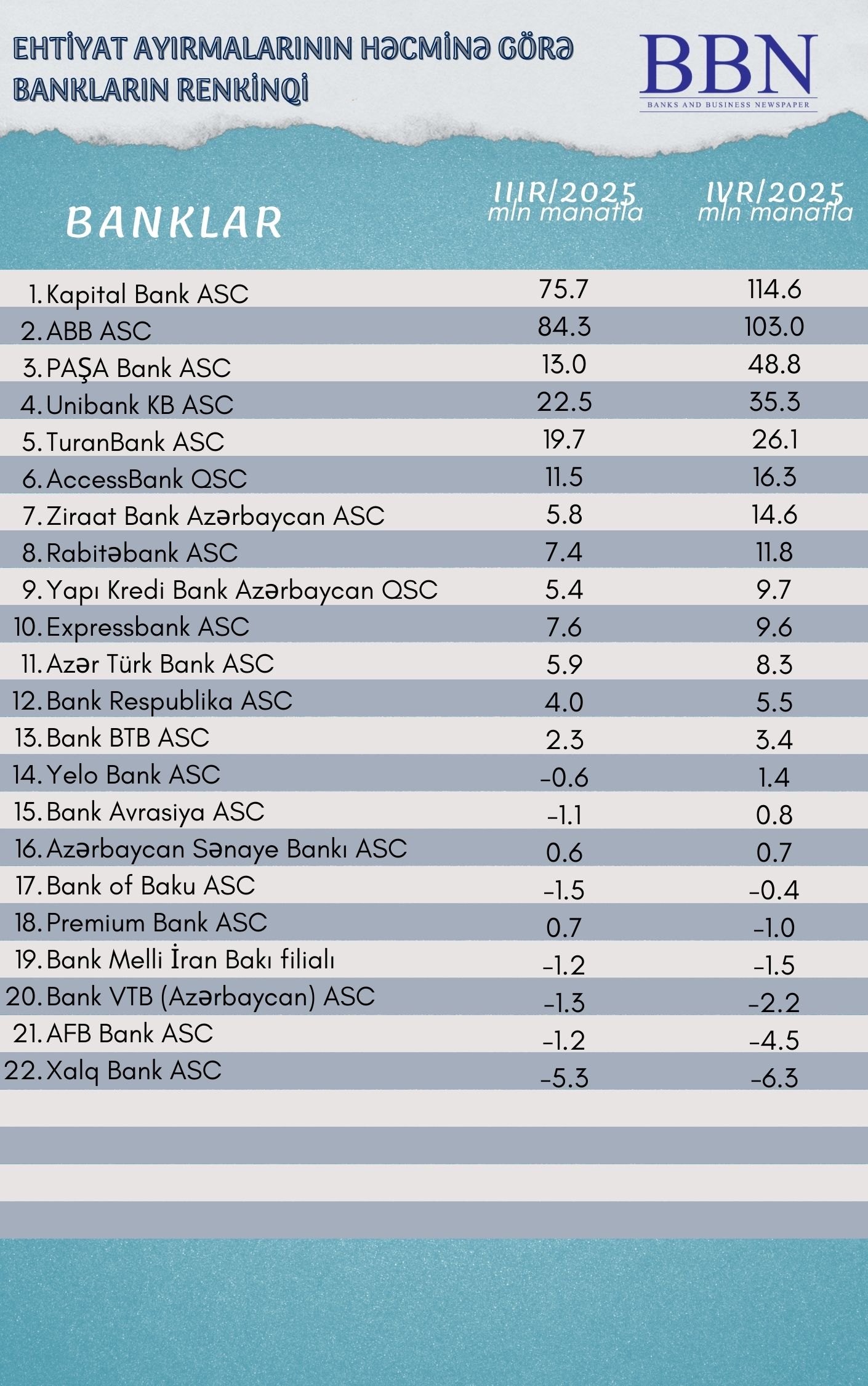 Banklar və Biznes nəşri BBN.az maliyyə göstəricilərini Azərbaycan Banklar Assosiasiyasına (ABA) təqdim etmiş bankların ehtiyat ayırmalarının həcminə görə renkinqini təqdim edir.