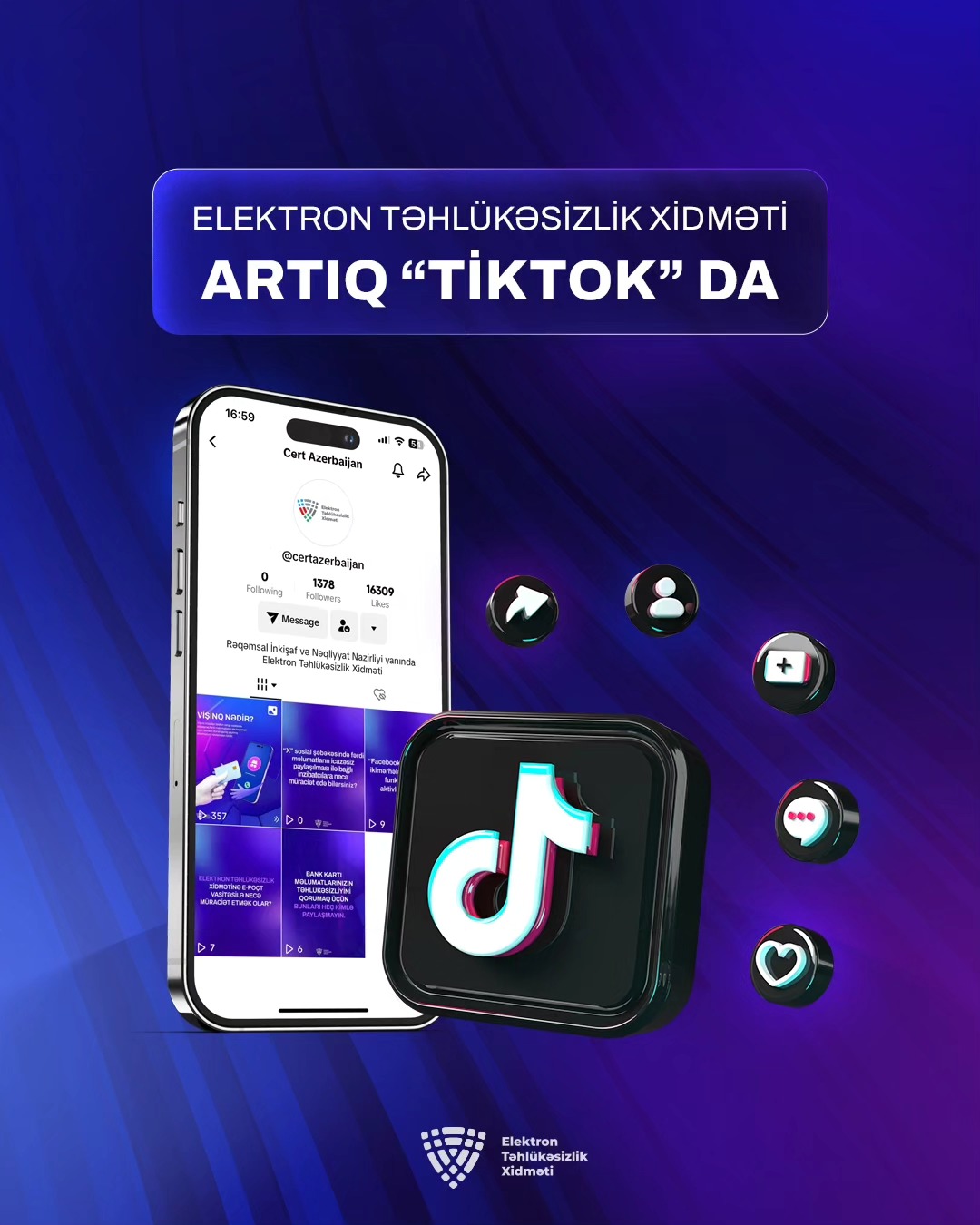 Elektron Təhlükəsizlik Xidmətinin “TikTok” səhifəsi istifadəyə verilib. Artıq paylaşımlarımızı “TikTok” səhifəmizdən də izləyə bilərsiniz. Səhifəmizi izləmək üçün qeyd olunan linkə https://www.tiktok.com/@certazerbaijan keçid etməyiniz kifayətdir.