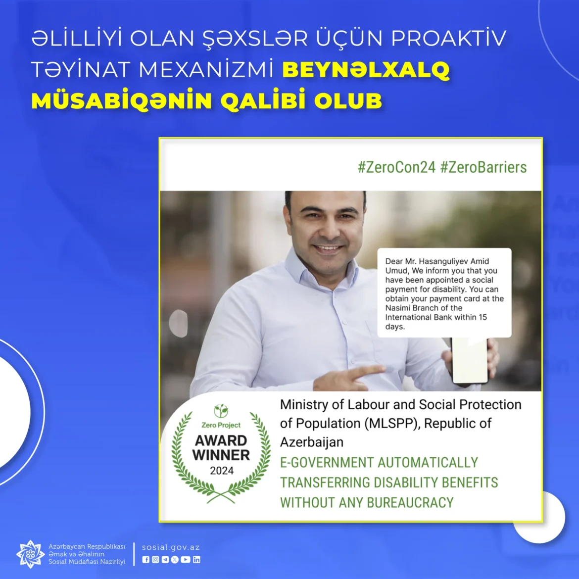 Əmək və Əhalinin Müdafiəsi Nazirliyinin əlilliyi olan şəxslər üçün proaktiv təyinat mexanizmi “Essl Fondu”nun “Zero Project Awardee 2024” müsabiqəsinin qalibi olub.