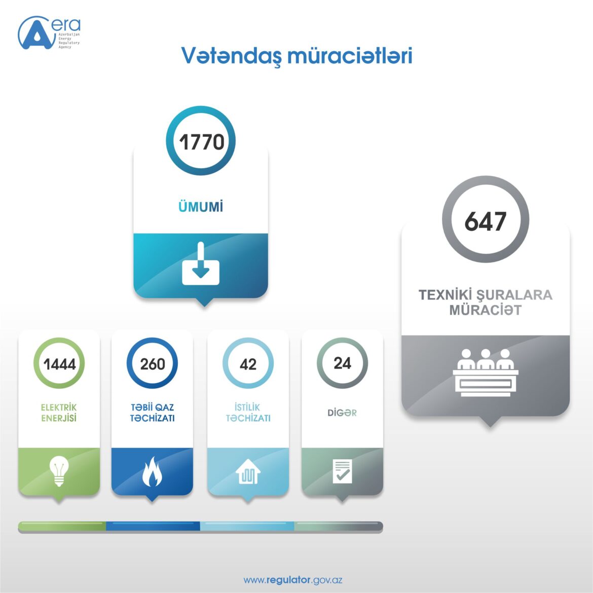 Müraciətlərdən 1183-ü Agentlik tərəfindən araşdırılıb və cavablandırılıb (18 müraciət müvafiq qaydada baxılması və tədbir görülməsi üçün aidiyyəti qurumlara göndərilib), 2 müraciət Energetika Nazirliyi ilə müştərək icra olunub, 388 müraciət hazırda baxılma prosesindədir, 197 məlumat xarakterli müraciətdən 100-ü qaldırılan problemlərin həlli ilə bağlı təşəkkür məktubu olub.