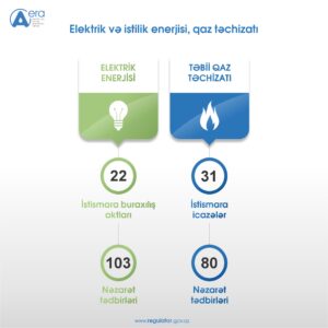 Həmçinin, elektrik qurğularının texniki istismarı, təhlükəsizlik texnikası qaydalarına əməl olunması və elektrik enerjisindən istifadənin vəziyyətinin araşdırılması məqsədilə 103 nəzarət tədbiri keçirilib. Qazdan səmərəli istifadənin, “Qazdan istifadə Qaydaları”nın və qaz qurğularının etibarlı istismarının, həmçinin digər normativ hüquqi aktların tələblərinə əməl olunmasının vəziyyətinin araşdırılması məqsədilə 80 nəzarət tədbiri keçirilib.