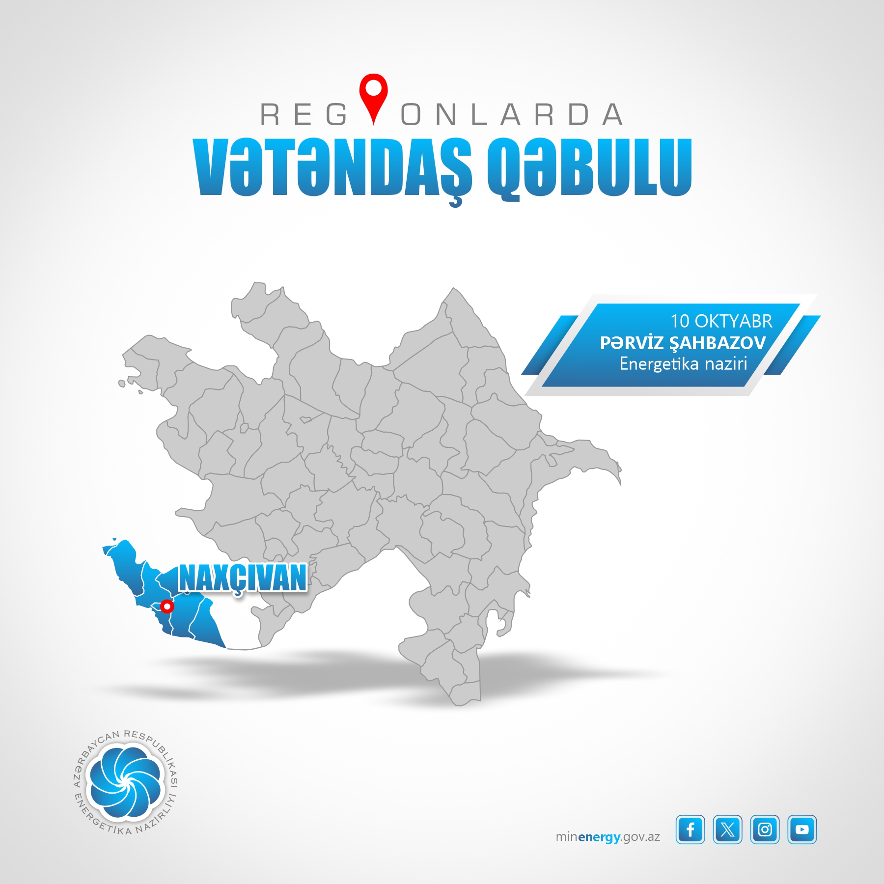 Energetika naziri Pərviz Şahbazov oktyabrın 10-da Naxçıvan şəhəri, Babək, Culfa, Kəngərli, Ordubad, Sədərək, Şahbuz və Şərur rayonlarından olan vətəndaşları qəbul edəcək.