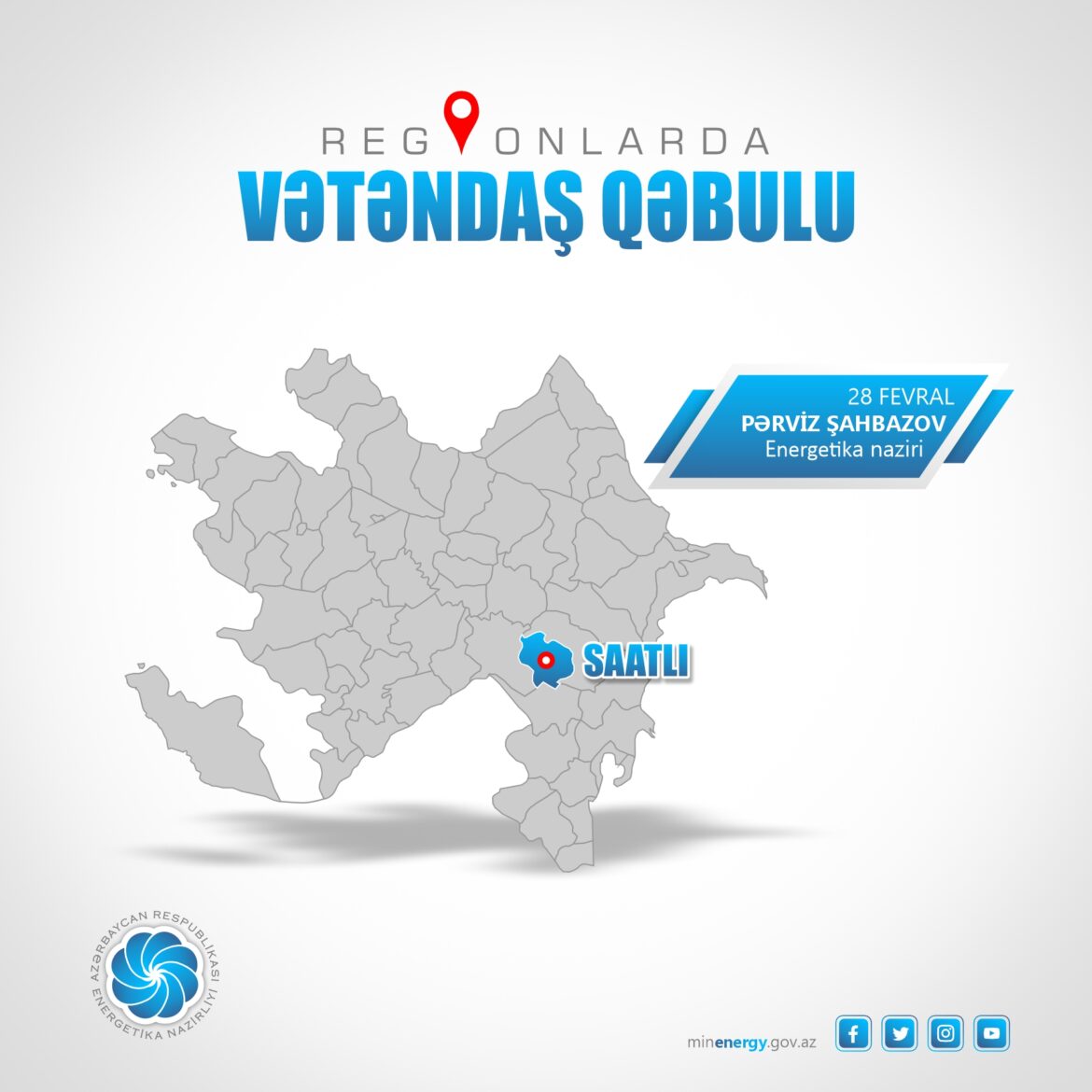 Energetika naziri Pərviz Şahbazov fevralın 28-də Saatlı, Sabirabad, İmişli, Biləsuvar, Hacıqabul rayonlarından olan vətəndaşları qəbul edəcək.