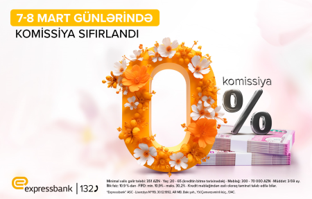 Expressbank 8 Mart münasibətilə yeni kampaniyaya start verib. Yalnız 2 gün, 7 və 8 mart tarixlərində bankda nağd kredit komissiyasız olacaq. Müştərilər 70 000 AZN-dək krediti maaş məbləğindən asılı olmayan faiz ilə, illik 10,9%-dən əldə edə bilərlər.