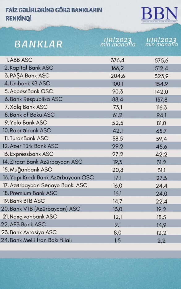 Banklar və Biznes nəşri BBN.az maliyyə göstəricilərini Azərbaycan Banklar Assosiasiyasına (ABA) təqdim etmiş bankların faiz gəlirlərinə görə renkinqini təqdim edir.
