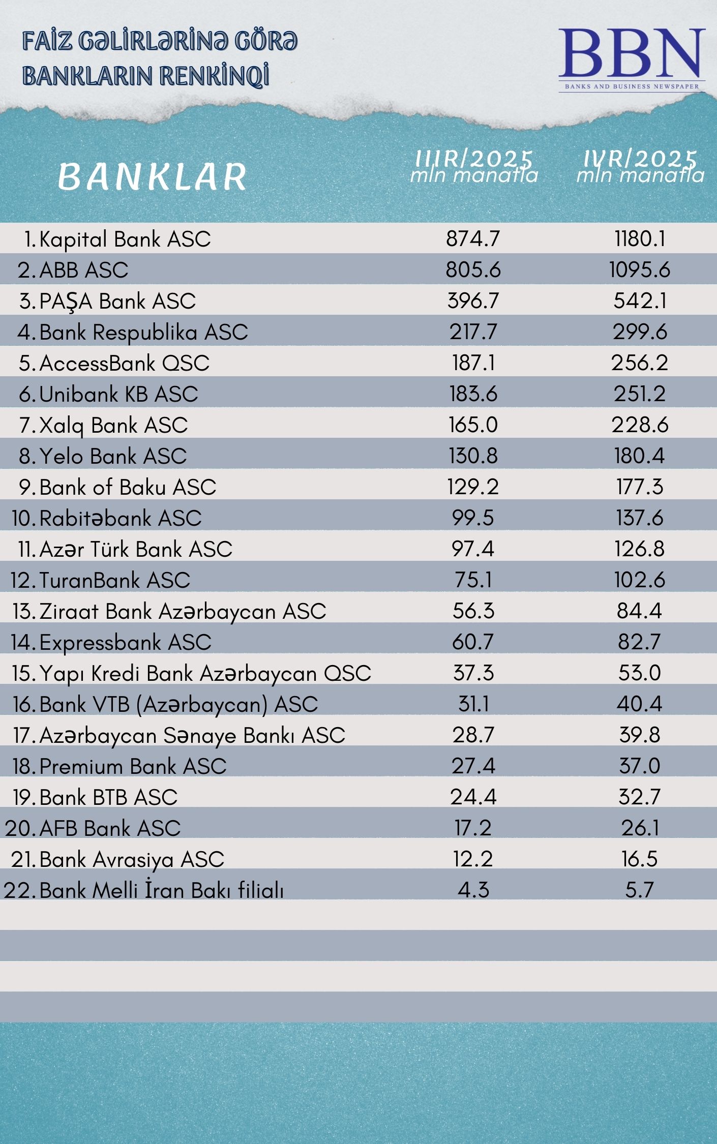 Faiz gəlirlərinə görə hesabatlarını açıqlayan bankların renkinqi aşağıdakı kimidir: