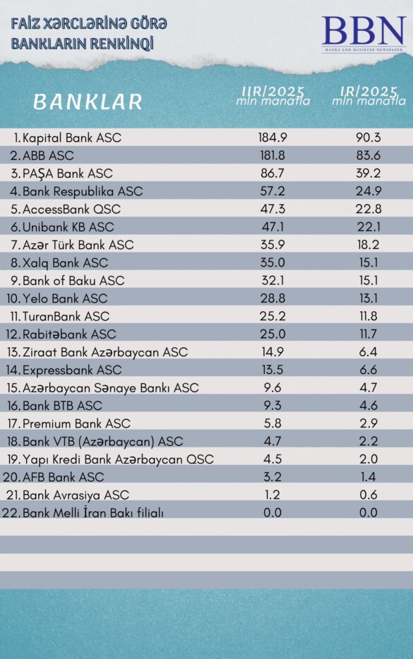 Banklar və Biznes nəşri BBN.az maliyyə göstəricilərini Azərbaycan Banklar Assosiasiyasına (ABA) təqdim etmiş bankların faiz xərclərinə görə renkinqini təqdim edir.