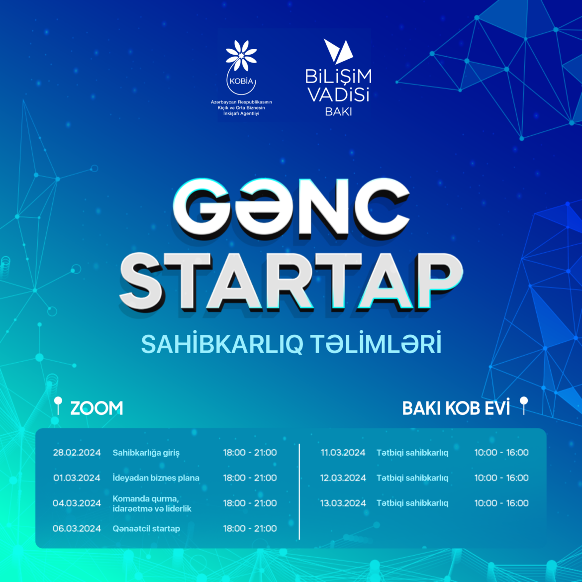 Qeyd edək ki, “Gənc startap” sahibkarlıq təlimləri biznes ideyası olan və onu startap layihəsinə çevirmək üçün dəstəyə ehtiyacı olan gənclər üçün təşkil edilib. KOBİA və Bilişim Vadisi Bakının birgə əməkdaşlığı çərçivəsində 2024-cü il ərzində startaplar və sahibkarlar üçün təlim və tədbirlər davam etdiriləcəkdir.