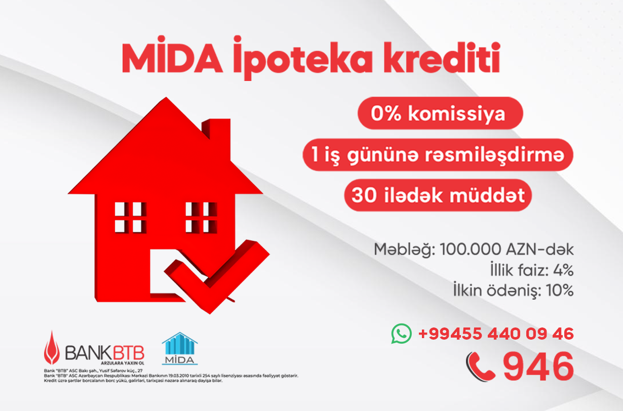 Bank “BTB” ASC olaraq Azərbaycan Respublikasının Mənzil İnşaatı Dövlət Agentliyi ilə müvəkkil bank kimi uzun müddətdir birgə əməkdaşlıq edirik, layihə çərçivəsində güzəştli MİDA kreditləri üzrə ölkə vətəndaşlarına yüksək xidmət göstəririk. Əməkdaşlığımız dövründə güzəştli MİDA kreditləri üzrə 1600 nəfərdən artıq ölkə vətəndaşına 67.5 mln manat həcmində portfelə xidmət göstərilib. Hazırda, bankımız tərəfindən MİDA layihəsi üzrə 1300 vətəndaşa 51 mln., manat portfel həcmində, ümumi olaraq 3800 nəfər ölkə vətəndaşına 165 mln., manat portfel həcmində ipoteka məhsulları üzrə xidmət göstərilir.