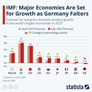 BBN.az xəbər verir ki, IMF-nin sonuncu iyul proqnozuna əsasən 2023-cü ildə Almaniyada ÜDM 0.2% enə bilər. Eyni zamanda təşkilat aprel ayındakı proqnozunda isə qeyd edirdi ki, 2023-cü ildə adıçəkilən ölkənin iqtisadiyyatında azalma 0.1% ola bilər. Bu isə Almaniyanı siyahıda yenə yeganə neqativ proqnoz nəticələri olan ölkə edir və təşkilat özünün aprel proqnozundan bəri ölkə üçün neqativ proqnozu dəyişməyib.