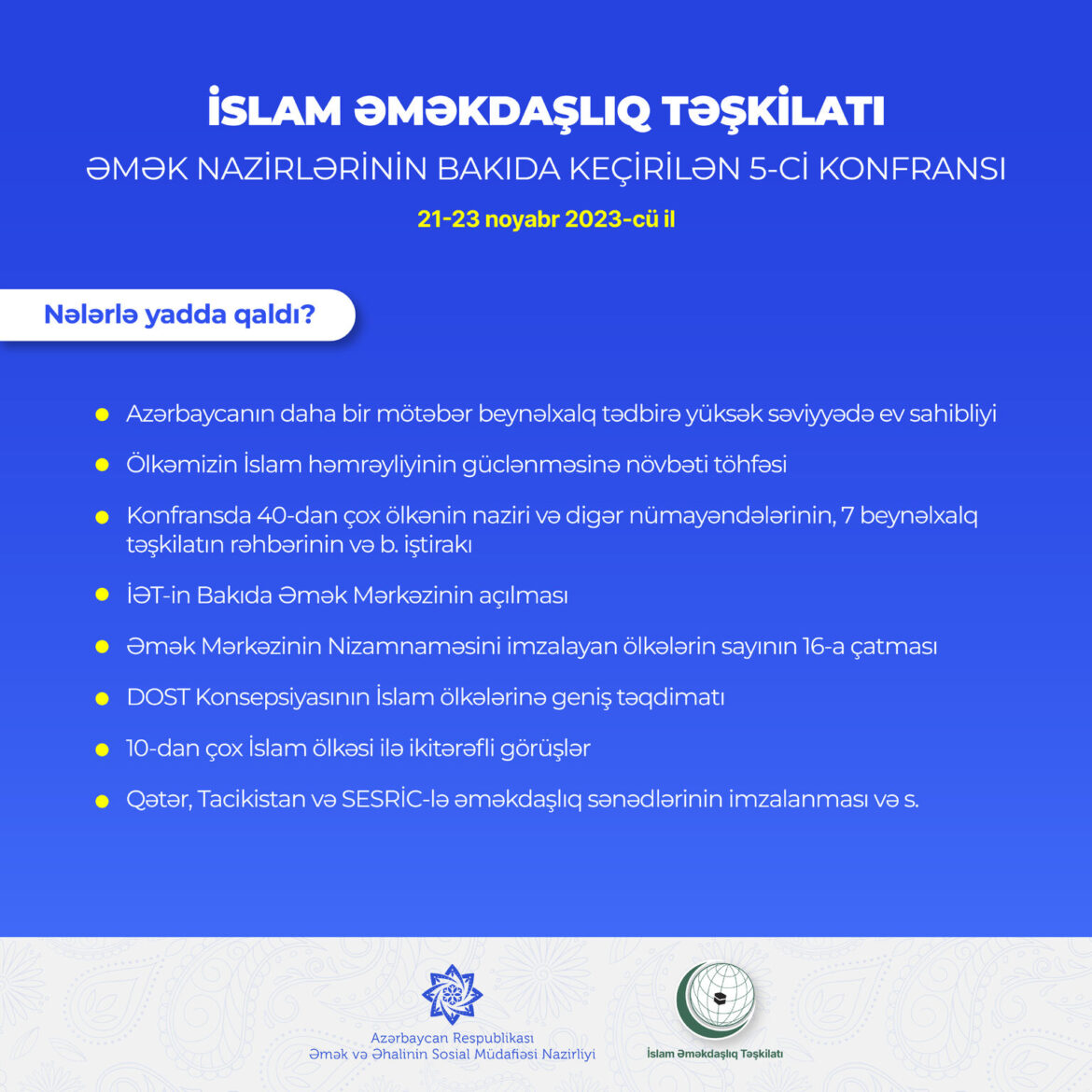 Ötən həftə (21-23 noyabr) Bakı daha bir böyük və mötəbər beynəlxalq tədbirə – İslam Əməkdaşlıq Təşkilatına (İƏT) üzv dövlətlərin əmək nazirlərinin 5-ci konfransına ev sahibliyi etdi.