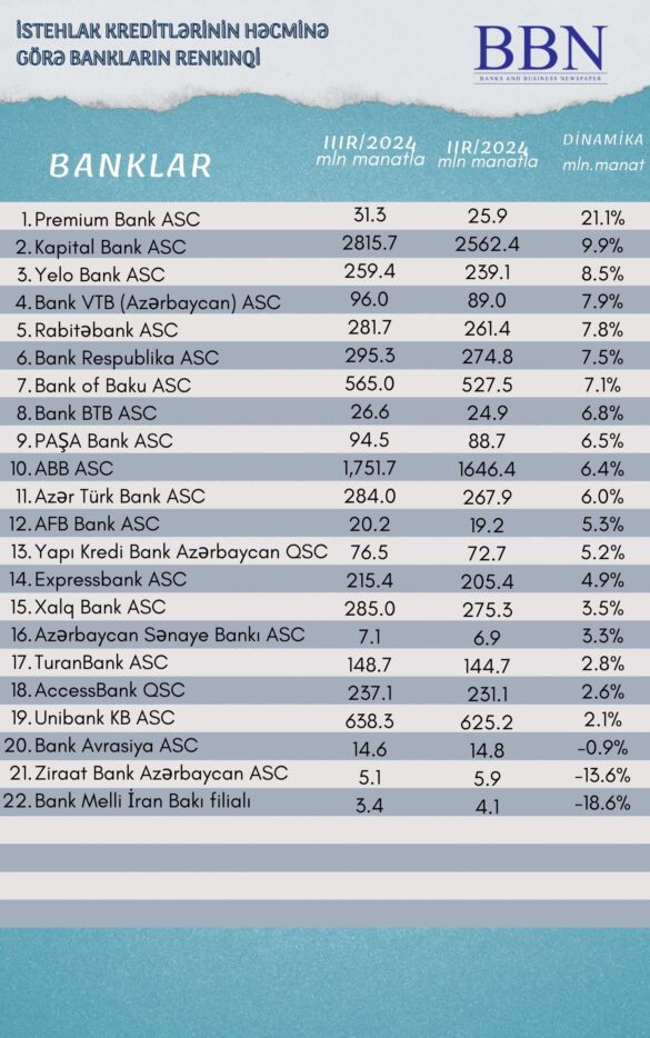 İstehlak kreditlərinin həcminə görə hesabatlarını açıqlayan bankların renkinqi aşağıdakı kimidir: