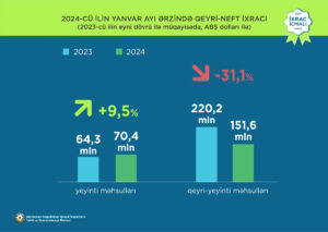 2024-cü ilin yanvar ayı ərzində yeyinti məhsulları üzrə ixrac ötən ilin müvafiq dövrü ilə müqayisədə 9,5% artaraq 70,4 milyon ABŞ dollarına, qeyri-yeyinti məhsulları üzrə ixrac isə 151,6 milyon ABŞ dollarına bərabər olub.
