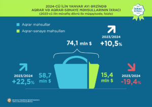 Cari ilin yanvar ayı ərzində aqrar və aqrar-sənaye məhsulları üzrə birgə ixracın statistik dəyəri 10,5% artaraq 74,1 milyon ABŞ dolları təşkil edib. Qeyri-neft/qaz ixracının tərkib hissəsində əhəmiyyətli yer tutan aqrar-sənaye məhsullarının yaratdığı dəyər isə 15,4 milyon ABŞ dolları olub.