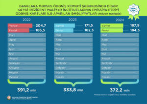 2024-cü ilin yanvar-fevral aylarında banklara məxsus ödəniş xidməti şəbəkəsində digər qeyri-rezident maliyyə institutlarının emissiya etdiyi ödəniş kartları ilə 372,2 milyon manat, yalnız fevral ayında isə 184,3 milyon manat dəyərində əməliyyat aparılıb.