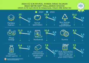 2024-cü ilin fevral ayında ixrac edilən qeyri-neft sektoruna aid malların siyahısında pambıq mahlıcı (23 milyon ABŞ dolları) birinci, pomidor (tomat) (13,4 milyon ABŞ dolları) ikinci və ilkin formalı propilen sopolimerləri (13,2 milyon ABŞ dolları) üçüncü olub.
