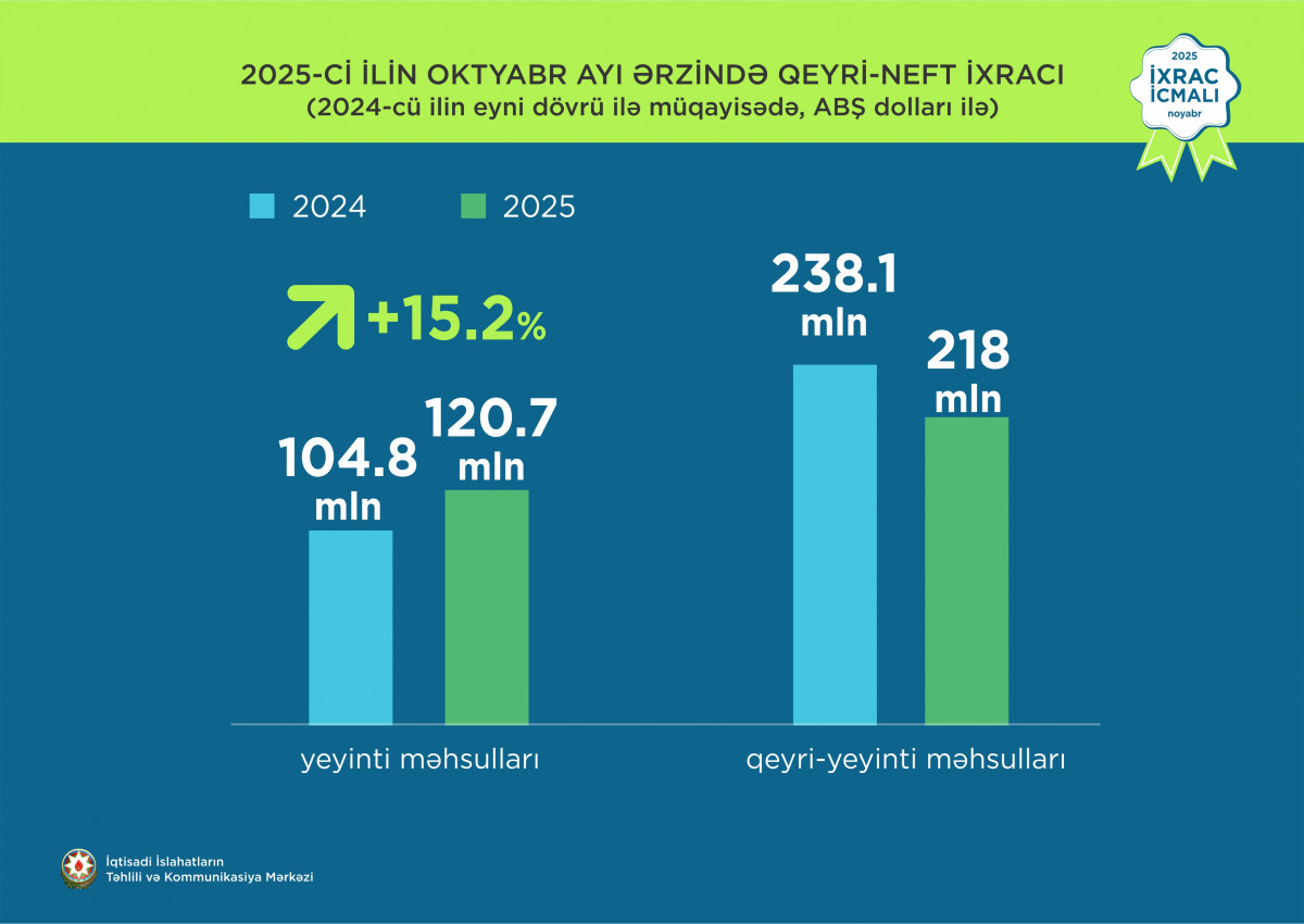 İcmala əsasən, 2025-ci ilin yanvar-oktyabr aylarında Azərbaycanın qeyri-neft sektoru üzrə ixracı 2024-cü ilin müvafiq dövrü ilə müqayisədə 6,6% artaraq 2,99 milyard ABŞ dolları təşkil edib. Qeyd olunan dövrdə yeyinti məhsulları üzrə ixrac 19,8% artaraq 962,1 milyon ABŞ dollarına bərabər olub.