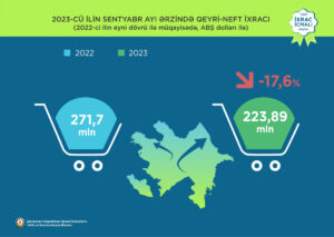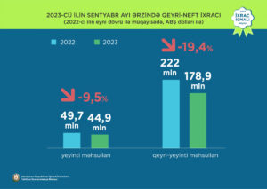 Cari ilin sentyabr ayının qeyri-neft ixracı 223,89 milyon ABŞ dolları olub. Bunun da 44,9 milyon ABŞ dollarını yeyinti məhsulları üzrə ixrac, 178,9 milyon ABŞ dollarını isə qeyri-yeyinti məhsulları üzrə ixrac təşkil edib.