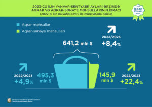 2023-cü ilin yanvar-sentyabr ayları ərzində aqrar və aqrar-sənaye məhsulları üzrə birgə ixracın statistik dəyəri 8,4% artaraq 641,2 milyon ABŞ dolları təşkil edib. Qeyri-neft/qaz ixracının tərkib hissəsində əhəmiyyətli yer tutan aqrar-sənaye məhsullarının yaratdığı dəyər ötən ilin müvafiq dövrü ilə müqayisədə 22,4% artaraq 145,9 milyon ABŞ dolları təşkil edib.