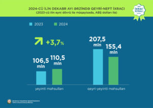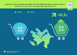 İqtisadi İslahatların Təhlili və Kommunikasiya Mərkəzi (İİTKM) “İxrac icmalı”nın yanvar ayı üçün ilkin rəqəmlərini təqdim edib. İcmala əsasən, 2024-cü ilin yanvar-dekabr ayları ərzində Azərbaycanın qeyri-neft-qaz ixracı 2023-cü ilin müvafiq dövrü ilə müqayisədə 0,3% artaraq 3,4 milyard ABŞ dolları təşkil edib. 2024-cü ilin yanvar-dekabr ayları ərzində yeyinti məhsullarının ixracı 11,3% artaraq 1,03 milyard ABŞ dollarına bərabər olub.