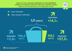 2024-cü ilin yanvar-dekabr ayları ərzində aqrar məhsulların ixracı 2,8% artaraq 789,4 milyon ABŞ dolları, aqrar-sənaye məhsullarının ixracı 57,3% artaraq 316,1 milyon ABŞ dollarına bərabər olub. Bütövlükdə aqrar və aqrar-sənaye məhsullarının birgə ixracı 14,1% artaraq 1,11 milyard ABŞ dolları təşkil edib.