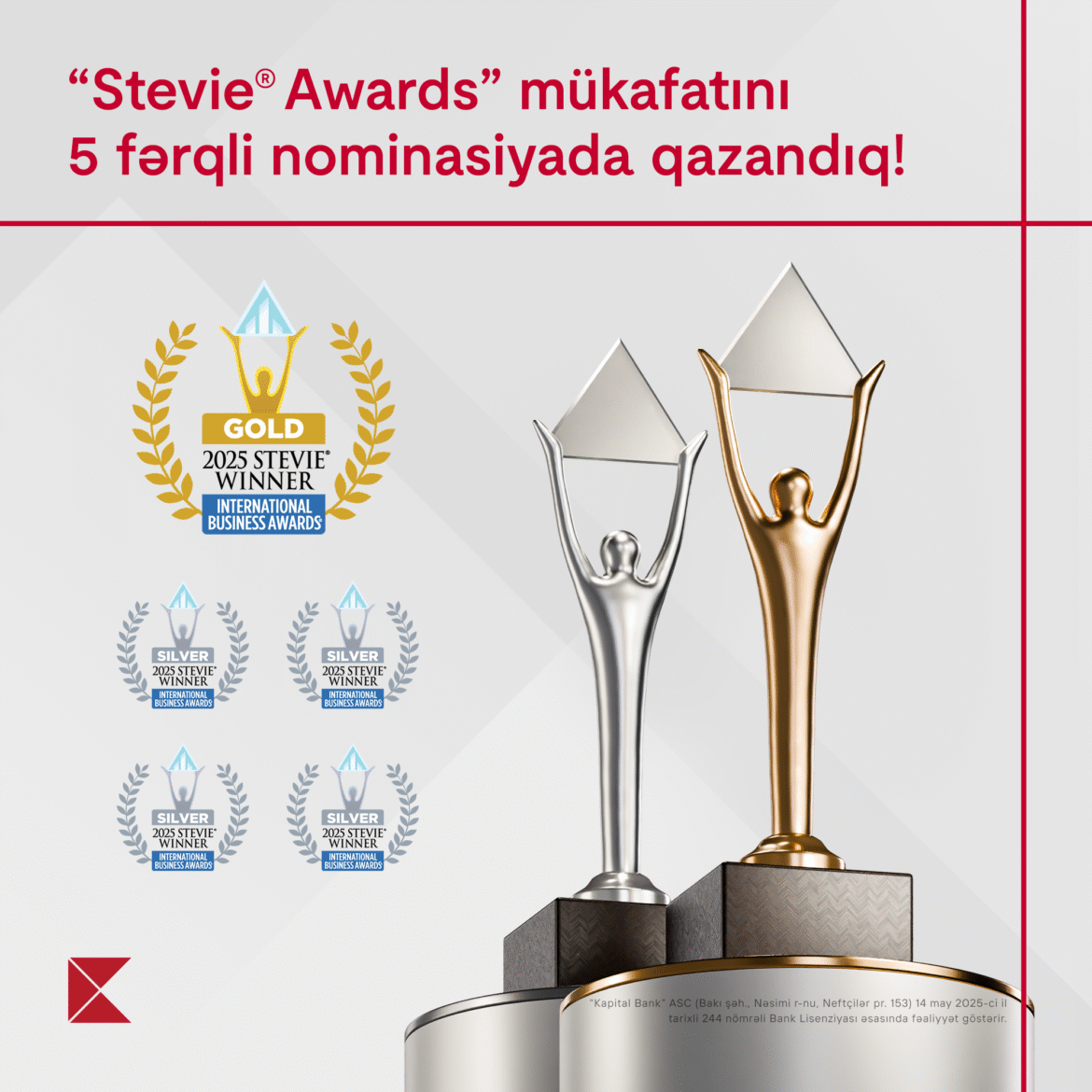 İnnovativ texnologiyaların tətbiqi və müştəriyönümlü proseslərlə bağlı layihələrlə proqrama qatılan Kapital Bank “İstehlakçı xidmətləri” nominasiyasında proqramın qızıl mükafatı “Gold Stevie Winner”, “İstehlakçı xidmətləri üzrə ilin liderlik kampaniyası”, “İlin müştəri xidməti departamenti”, “Müştəri xidmətləri üzrə həllər” və “Müştəri məmnuniyyətində nailiyyət” nominasiyalarında isə “Silver Stevie Winner” gümüş mükafatlarına layiq görülüb.