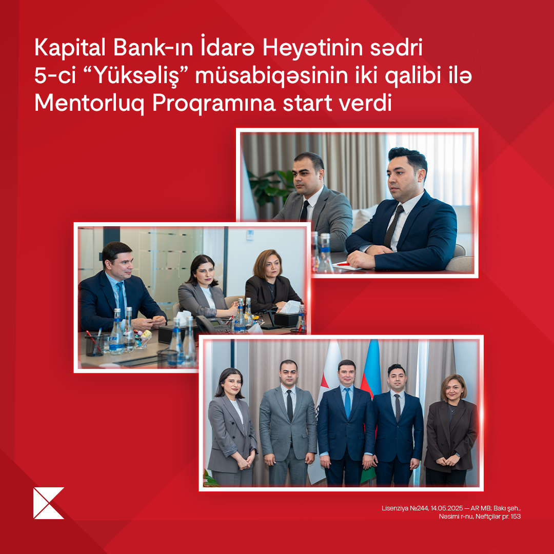 Kapital Bank-ın İdarə Heyətinin sədri Fərid Hüseynov sayca beşinci “Yüksəliş” müsabiqəsinin Mentorluq Proqramı çərçivəsində qaliblərlə ilk görüşünü keçirib. Proqram çərçivəsində bu il Fərid Hüseynov müsabiqənin iki qalibinin – Fərid Mustafayev və Elnur Mirzəzadənin mentoru qismində çıxış edərək onların fərdi inkişaf planına dəstək verəcək.
