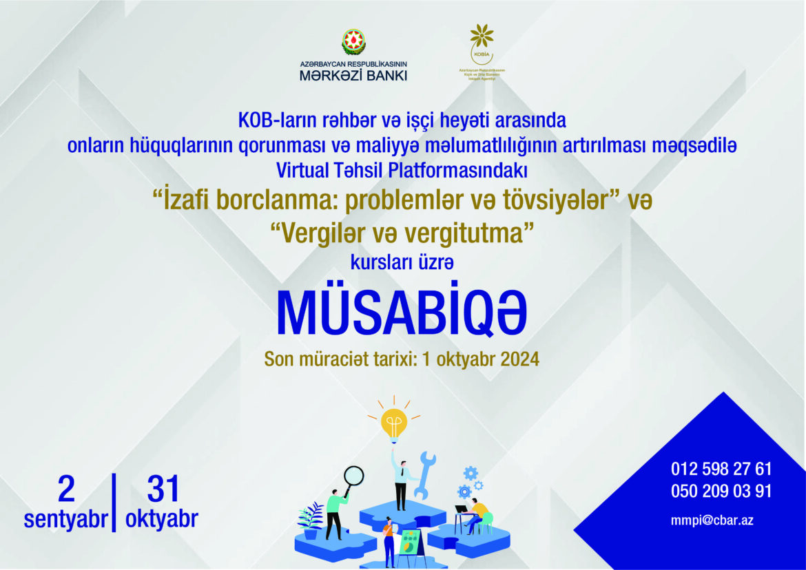 Azərbaycan Respublikasının Mərkəzi Bankı (AMB) və Kiçik və Orta Biznesin İnkişafı Agentliyi (KOBİA) KOB-ların rəhbər və işçi heyəti arasında 2 sentyabr – 31 oktyabr 2024-cü il tarixlərində müsabiqə elan edir.