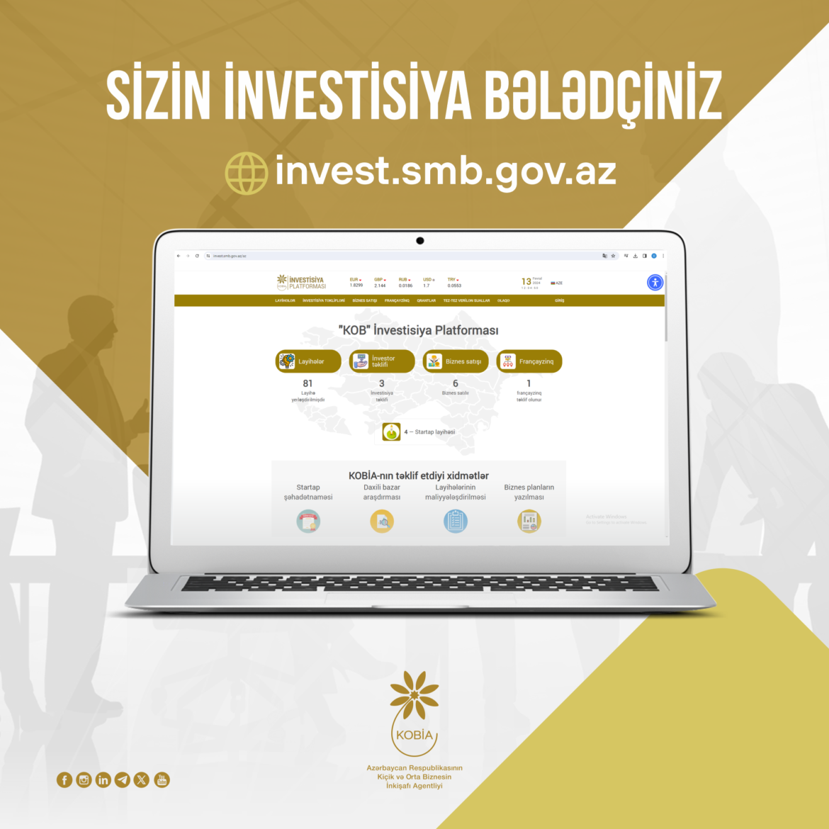 Qeyd edək ki, www.invest.smb.gov.az portalı KOBİA tərəfindən Azərbaycanda kiçik və orta sahibkarlıq subyektlərinin investisiya imkanlarını genişləndirmək məqsədilə yaradılıb. Layihəsinə investor axtaran sahibkarlar, startaplar, eləcə də sərmayə qoymaq üçün layihə axtarışında olan investorlar portalın imkanlarından faydalana bilərlər. Portaldan istifadə etmək ödənişsizdir.