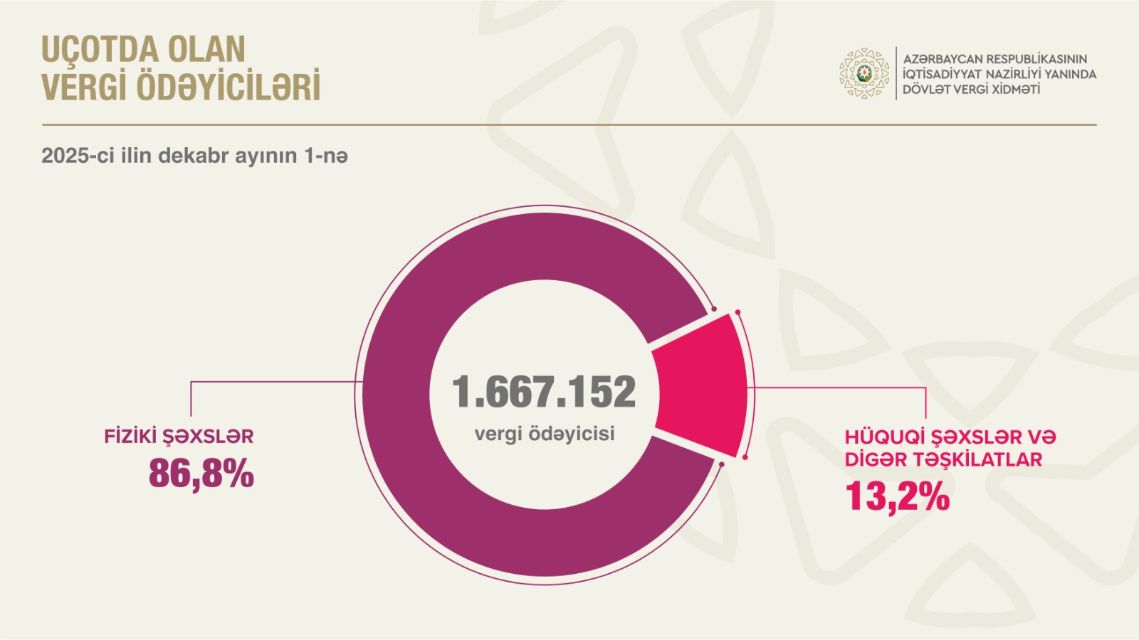 2025-ci ilin dekabr ayının 1-nə respublika üzrə uçotda olan 1.667.152 vergi ödəyicisinin 86,8 faizi fiziki şəxslər, 13,2 faizi hüquqi şəxslər və digər təşkilatlar olub. 2024-cü ilin müvafiq dövrü ilə müqayisədə vergi ödəyicilərinin ümumi sayı 4,8 faiz, o cümlədən fiziki şəxslərin sayı 4,5 faiz, hüquqi şəxslərin sayı 6,9 faiz artıb.
