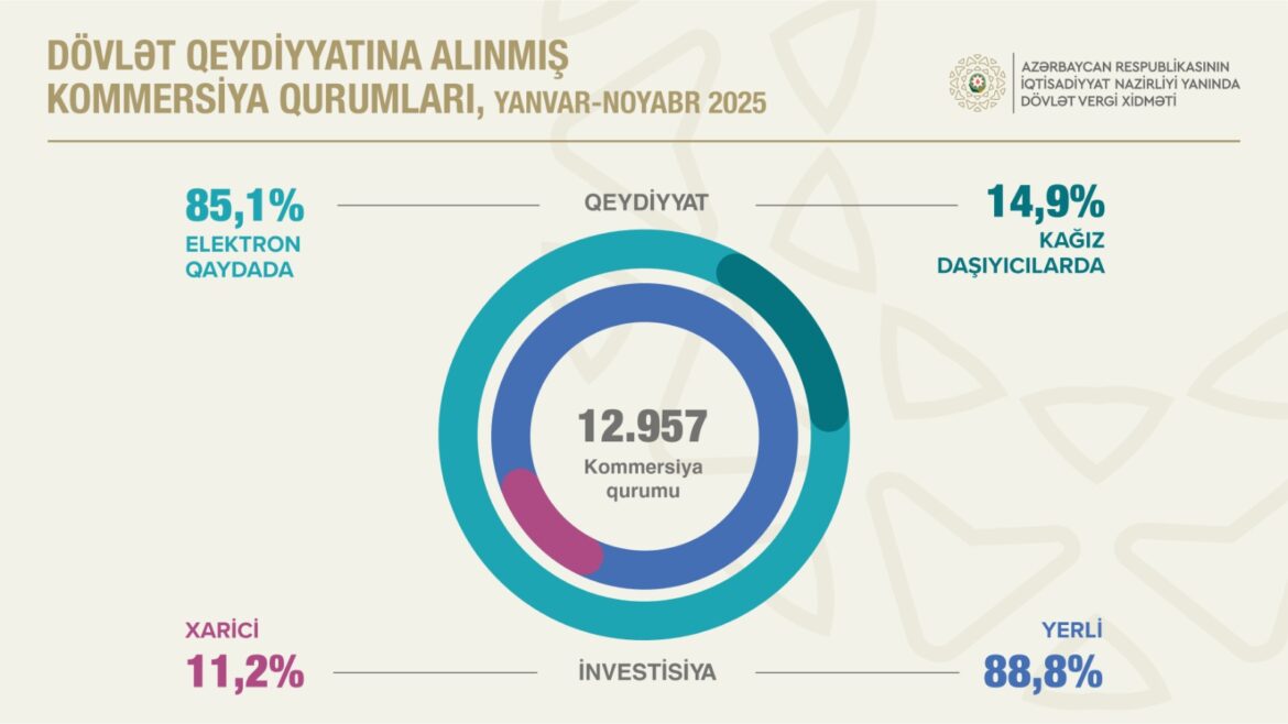 2025-ci ilin yanvar – noyabr aylarında 12.957 kommersiya qurumu dövlət qeydiyyatından keçib ki, onların 88,8 faizi yerli investisiyalı, 11,2 faizi xarici investisiyalıdır. Kommersiya qurumlarının 85,1 faizi elektron qaydada qeydiyyata alınıb. Yerli investisiyalı məhdud məsuliyyətli cəmiyyətlərin e-qeydiyyatının xüsusi çəkisi 96,4 faiz təşkil edib.