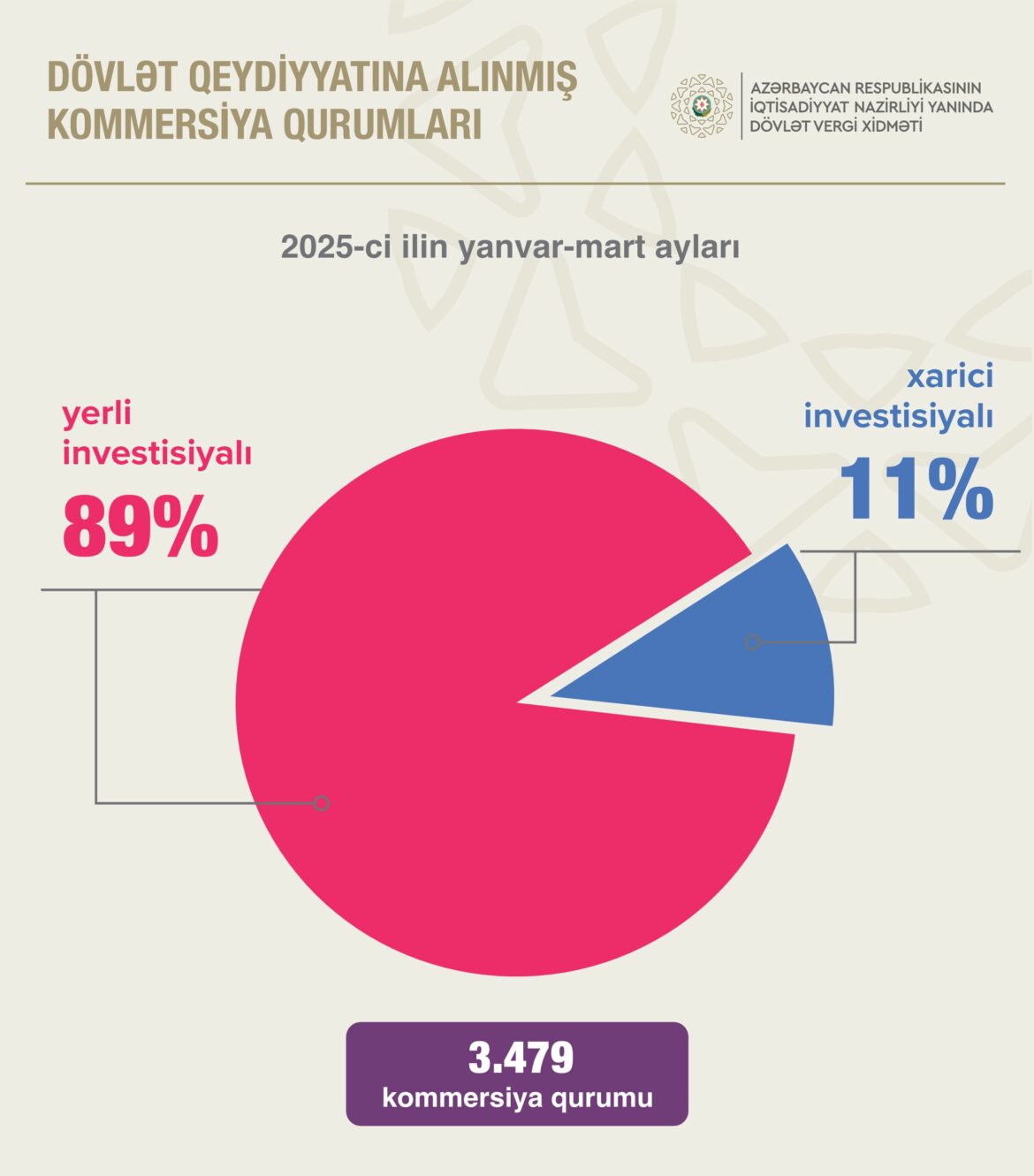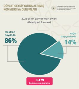 2025-ci ilin yanvar-mart aylarında 3.479 vahid kommersiya qurumu dövlət qeydiyyatından keçib ki, onların da 89 faizi yerli investisiyalı, 11 faizi xarici investisiyalıdır. Kommersiya qurumlarının 86 faizi elektron qaydada qeydiyyata alınıb. Hesabat dövründə qeydiyyatdan keçmiş yerli investisiyalı məhdud məsuliyyətli cəmiyyətlərin e-qeydiyyatının xüsusi çəkisi 97 faiz təşkil edib.