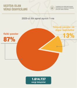 2025-ci ilin aprel ayının 1-nə respublika üzrə uçotda olan 1.614.737 vergi ödəyicisinin 87 faizi fiziki şəxslər, 13 faizi hüquqi şəxslər və digər təşkilatlar olub. Ötən ilin müvafiq dövrü ilə müqayisədə vergi ödəyicilərinin ümumi sayı 5 faiz, o cümlədən fiziki şəxslərin sayı 4,6 faiz, hüquqi şəxslərin sayı 7,6 faiz artıb. Dövlət qeydiyyatında olan kommersiya hüquqi şəxslərin 91,6 faizi məhdud məsuliyyətli cəmiyyət, 1,1 faizi səhmdar cəmiyyət, 1,1 faizi kooperativ və s. formalarda yaradılıb. Aprel ayının 1-nə qeydiyyatda olan kommersiya qurumlarının sayı ötən ilin müvafiq dövrü ilə müqayisədə 8,2 faiz artaraq 193.780 vahid təşkil edib.