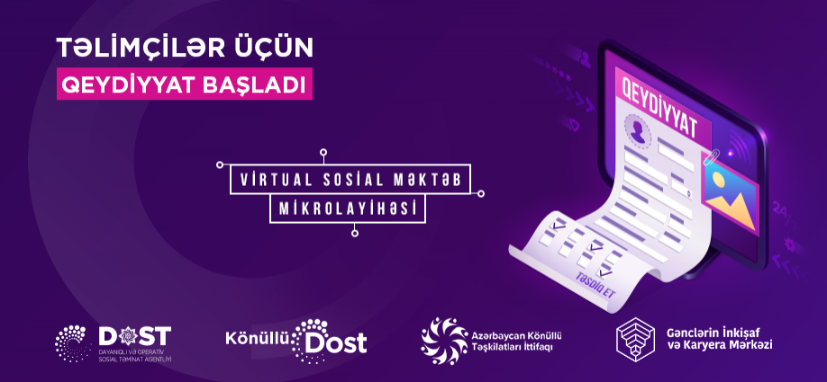 DOST Agentliyinin “Könüllü DOST” proqramının “Distant DOST” altproqramı çərçivəsində “Virtual Sosial Məktəb” mikrolayihəsinə start verilir. Layihə çərçivəsində “Sosial iş” istiqamətində könüllü təlimçilər tərəfindən region gənclərinə təlimlər keçiriləcək. Öz bilik və bacarıqlarına güvənənlər könüllü təlimçi qismində layihəyə qoşula bilər.