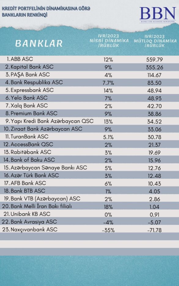 Banklar və Biznes nəşri BBN.az maliyyə göstəricilərini Azərbaycan Banklar Assosiasiyasına (ABA) təqdim etmiş bankların Kredit portfelinin dinamikasına görə renkinqini təqdim edir.