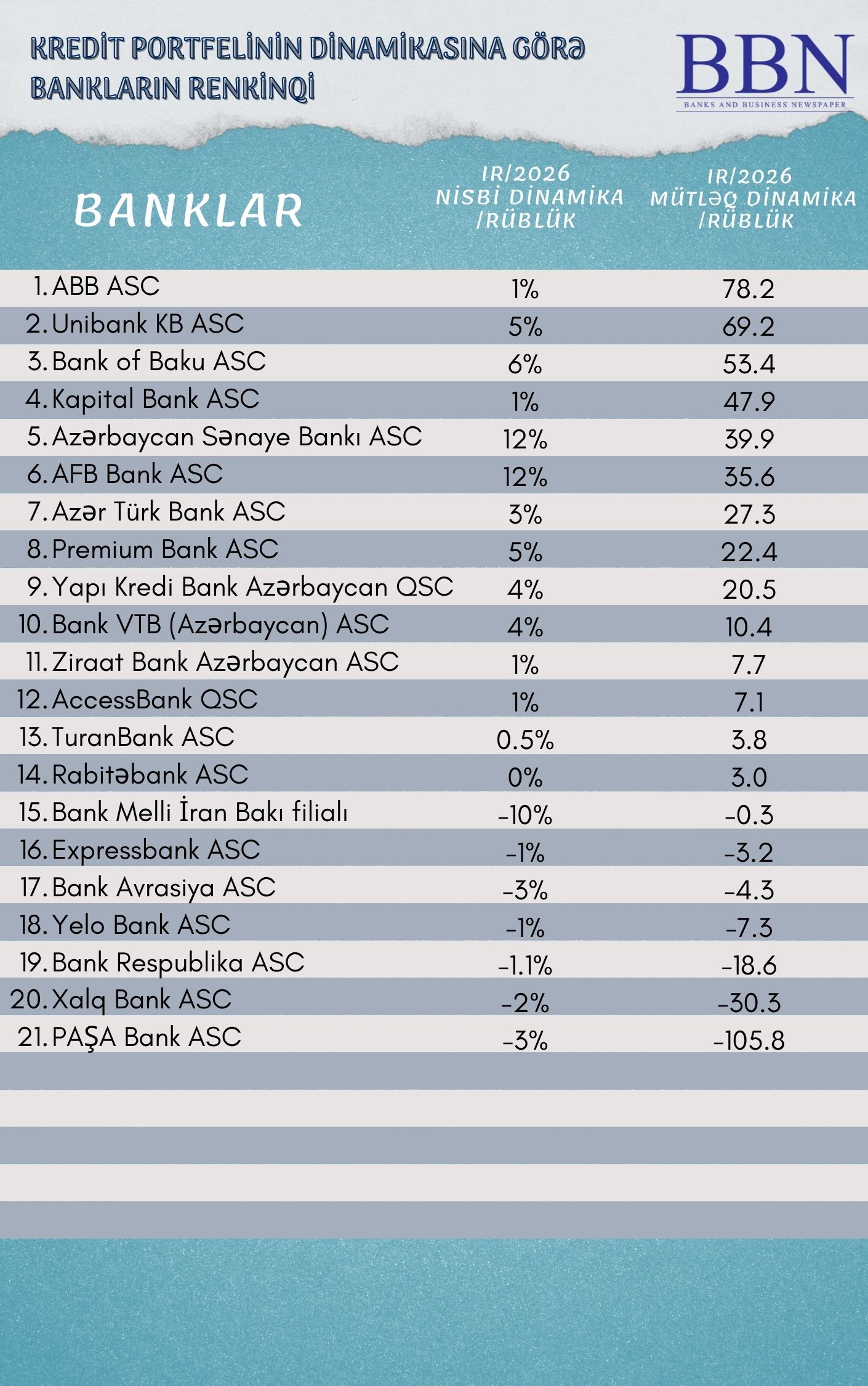 Banklar və Biznes nəşri BBN.az maliyyə göstəricilərini Azərbaycan Banklar Assosiasiyasına (ABA) təqdim etmiş bankların Kredit portfelinin dinamikasına görə renkinqini təqdim edir.