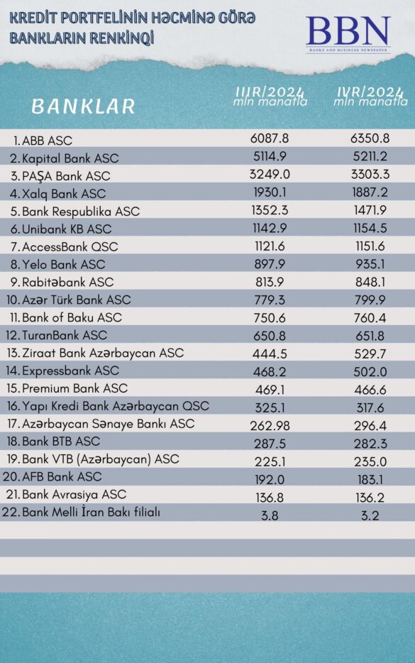Banklar və Biznes nəşri BBN.az maliyyə göstəricilərini Azərbaycan Banklar Assosiasiyasına (ABA) təqdim etmiş bankların kredit portfelinin həcminə görə renkinqini təqdim edir.